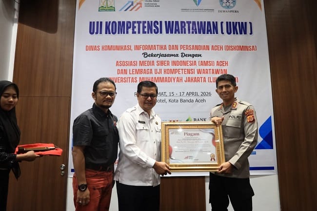 Penghargaan tersebut diserahkan pada Rabu, 15 April 2026, dalam rangkaian kegiatan Uji Kompetensi Wartawan (UKW) dan Seminar Nasional bertema “Membangkitkan Ekosistem Bisnis Perusahaan Media di Provinsi Aceh Pasca Bencana Hidrometeorologi”.