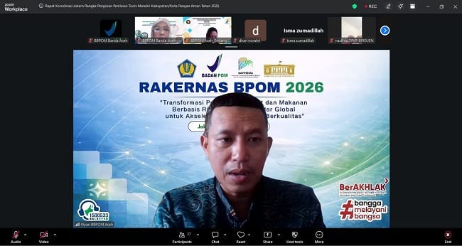 BANDA ACEH — Balai Besar Pengawas Obat dan Makanan di Banda Aceh (BBPOM Aceh) menggelar Rapat Koordinasi Pengisian Tools Mandiri Kabupaten/Kota Pangan Aman (KKPA) Tahun 2026 secara daring, Jumat (17/04/2026).