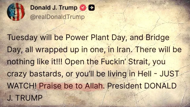 “Selasa akan menjadi Hari (penyerangan) Pembangkit Listrik dan Hari (penyerangan) Jembatan, yang semuanya dirangkai menjadi satu, di Iran. Belum ada serangan seperti ini!!! Buka Selatnya, Sialan, dasar bajingan gila, atau kamu akan tinggal di Neraka – LIHAT SAJA! Segala puji bagi Allah. Presiden DONALD J TRUMP,” demikian kira-kira terjemahan dari unggahan Trump. Dalam bahasa aslinya, bahasa Inggris, unggahan itu lebih menjijikkan.